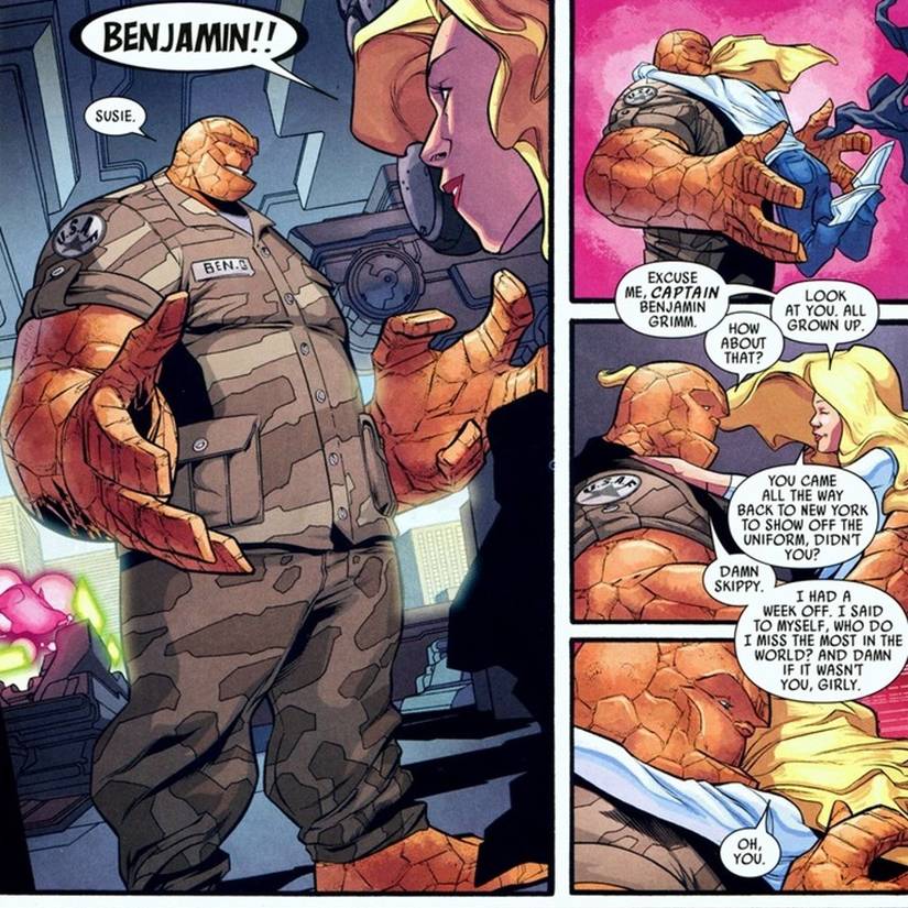 El propio Ben pasa por un gran cambio, vuelve a su forma humana y adopta una nueva forma en la que brilla con una radiación violeta. En su forma humana, Sue y Ben se acercan más. Ben termina confesando su amor por Sue durante el arco de “Ultimate Enemy”, pero ella no siente lo mismo. Sin embargo, con el tiempo, la Mujer Invisible se siente atraída por Ben y confiesa que, de hecho, lo ama. Va un paso más allá al proponerle matrimonio, lo que él acepta felizmente.