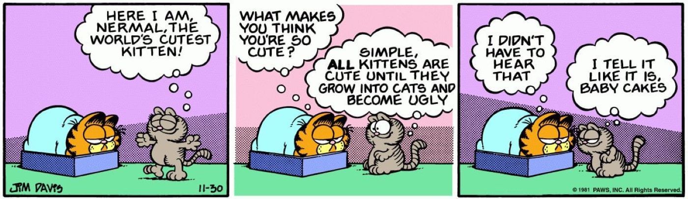 El eslogan icónico de Nermal: “¡El gatito más lindo del mundo!” se ha convertido en un aspecto querido de su personaje, y con frecuencia sirve como un chiste de larga duración en sus apariciones en historietas. Este eslogan, que funciona como una peculiaridad y un testimonio de su rasgo definitorio –el egocentrismo–, subraya un sentido compartido de importancia personal con Garfield, que a menudo alimenta sus frecuentes enfrentamientos. En esta tira, el egoísmo descarado de Nermal toma el foco de atención, ya que ofrece una evaluación contundente y ambigua de la apariencia de Garfield como “feo.” Esto ejemplifica la rica dinámica de carácter que se encuentra en garfield cómics, que han cautivado y divertido constantemente a los lectores durante décadas.