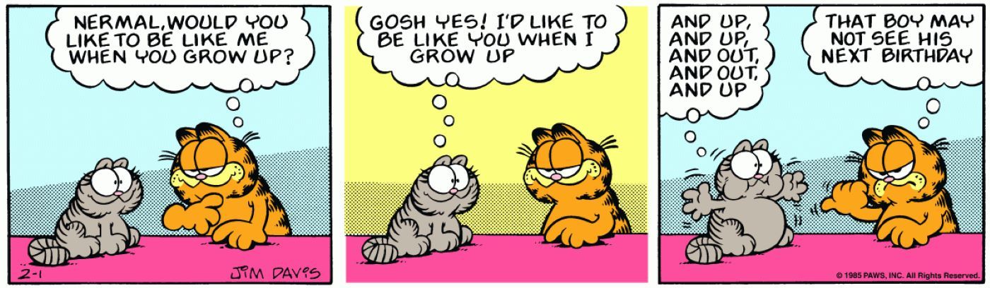 En este cómic, vemos un excelente ejemplo de lo que ha hecho que las tiras de Davis sean tan populares. Lo que inicialmente parece un momento conmovedor compartido entre los dos personajes felinos, rápidamente toma un desvío divertido e inesperado hacia el reino de los insultos juguetones. A primera vista, parece que Nermal le está haciendo un cumplido a Garfield, expresando su deseo de emular al gato mayor a medida que crezca. Sin embargo, el cómic da un giro inteligente cuando el gato más joven bromea: “Me gustaría ser como tú cuando sea grande… y arriba, y arriba, y afuera, y afuera….” La broma de Nermal se burla sutilmente del mayor tamaño de Garfield, para disgusto del gato mayor.