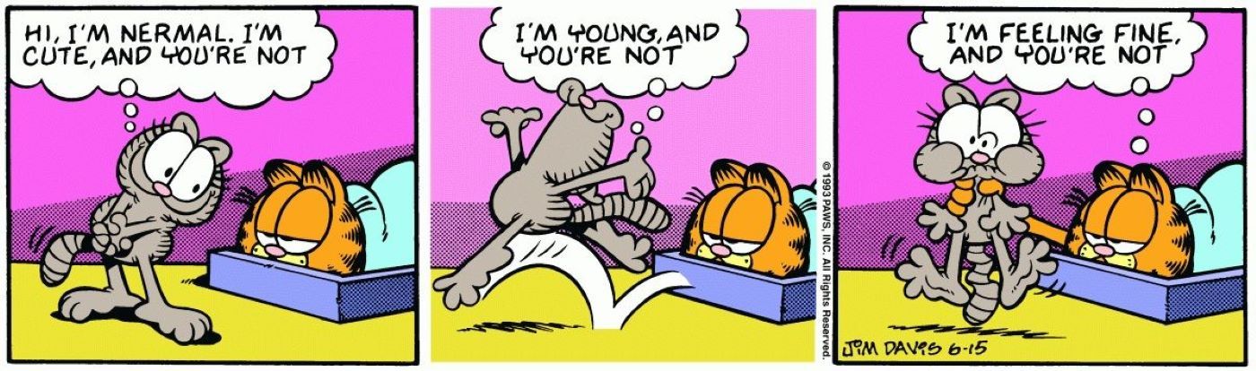 Una vez más, el núcleo del humor de este cómic gira en torno al narcisismo sin remordimientos de Nermal, a partir de la reacción moderada, pero no obstante molesta, de Garfield ante el comportamiento del gatito. El felino más joven se pavonea alrededor de Garfield, prodigándose con elogios y, al mismo tiempo, lanzando golpes juguetones al gato mayor. Esta dinámica por sí sola provoca risas, especialmente cuando cada elogio que Nermal se otorga a sí mismo concluye con un mordisco: “y tu no“, apuntó directamente a Garfield. Sin embargo, es el gato naranja quien tiene la última palabra en este intercambio, cuando extiende la mano y agarra a Nermal por el cuello, luego le canta canciones al gato más joven, “Me estoy sintiendo bien. Y tu no“.