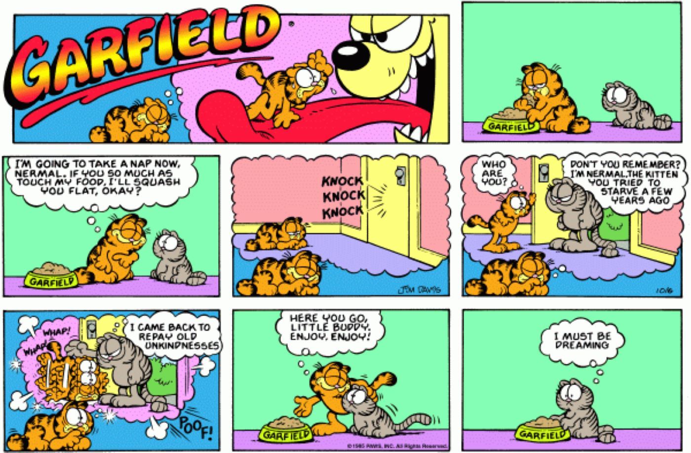 Los fanáticos devotos de Garfield saben muy bien que motivar al famoso e indiferente gato naranja a actuar no es poca cosa, a menos, por supuesto, que se trate de comida. En este cómic, Garfield advierte severamente a Nermal que no coma su comida mientras duerme la siesta. Sin embargo, en un giro encantador, los sueños de Garfield evocan un futuro en el que Nermal regresa años después en busca de venganza por no haber compartido, dejando a Garfield en un estado de inanición. La tira cómica concluye con una nota de humor cuando Garfield, siempre fiel a sus prioridades, le ofrece su comida a Nermal, conmocionado. Esta escena subraya de manera hilarante que, por encima de todo, la comida reina en el mundo de Garfield.