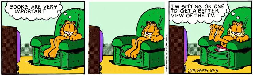Garfield no sólo no está leyendo un libro, y no sólo está sentado sobre un libro, sino que está usando un libro para apoyarse y mirar televisión más fácilmente. En otras palabras, El uso que Garfield hace de este libro es un absoluto insulto para los amantes de los libros de todo el mundo..