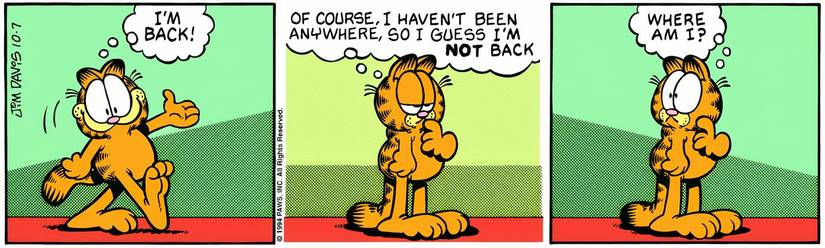 Garfield entra alegremente en el primer panel de esta tira cómica, rompiendo la cuarta pared de inmediato. Garfield dice alegremente: “¡Ya estoy de vuelta!“, pero en el siguiente panel, su felicidad comienza a desvanecerse y el horror la reemplaza. Garfield comenta que en realidad no ha ido a ninguna parte, por lo que en realidad no está “atrás“. Entonces, Garfield comienza a perder el control de su propia realidad, mira a su alrededor con los ojos muy abiertos y pregunta: “¿Dónde estoy?“.