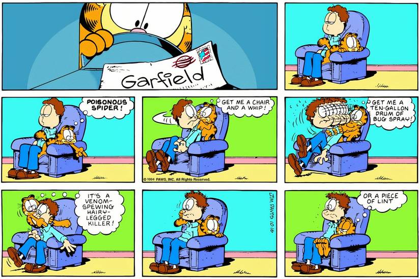 Mientras está sentado en una silla junto a Jon, Garfield mira la alfombra y cree haber visto una araña. Garfield inmediatamente comienza a enloquecer, temblando y trepando por todo Jon, gritando que necesita matar a la araña antes de que los muerda. Después de que Garfield se calma, mira más de cerca a la ‘araña’ y descubre que no es más que un trozo de pelusa.