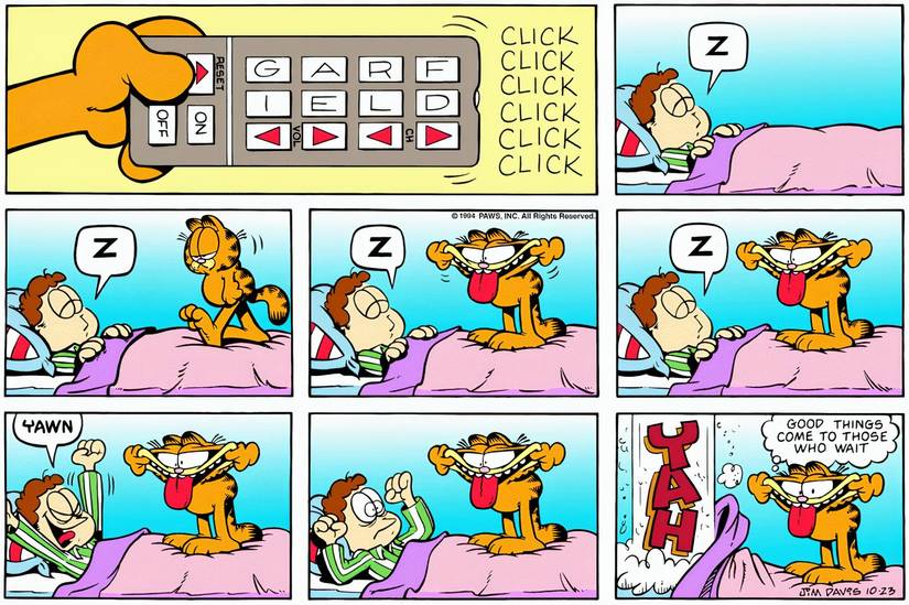 Sorprender a alguien que no se lo esperaba con una cara de miedo es una broma absolutamente clásica, y Garfield la lleva a cabo a la perfección. El gato naranja incluso espera un buen rato a que Jon se despierte y, como él mismo señala, valió la pena (graciosamente).