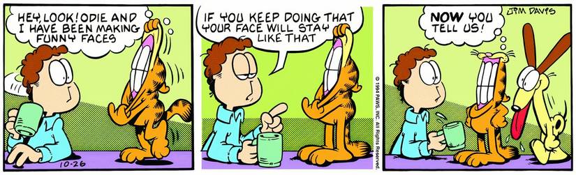 Garfield le muestra a Jon con entusiasmo lo que él y Odie han estado haciendo todo el día: hacer muecas. Garfield estira sus labios sobre sus enormes dientes, contorsionando su rostro hasta que no es más que una sonrisa gigante. Mientras tanto, el rostro de Odie también ha sido alterado, con la cabeza alargada, las orejas torcidas y la lengua fuera permanente de la boca. Después de ver esto, Jon advierte a Garfield que si él y Odie siguen así, sus caras seguirán así, y eso es exactamente lo que sucede..