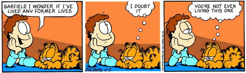 Mientras los dos están juntos en la casa, Jon casualmente le pregunta a Garfield si cree que ha vivido alguna vida pasada. Jon claramente está considerando la idea de la reencarnación y se pregunta si Garfield tiene alguna idea al respecto. En lugar de entablar una conversación significativa sobre este tema, Garfield opta por ser increíblemente cruel, como le responde a Jon: “Dudo. Ni siquiera estás viviendo este“.