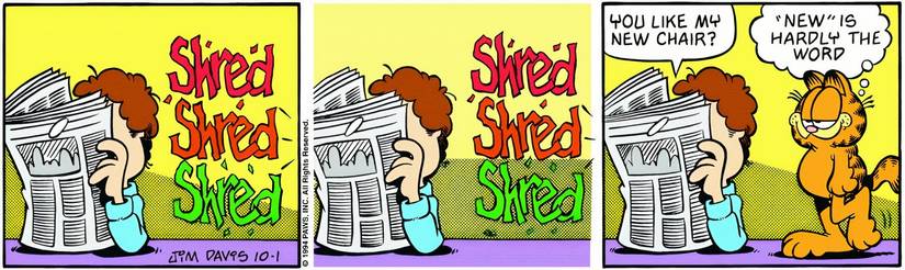 Mientras Jon está sentado junto a su mostrador, leyendo el periódico, no oye nada más que el sonido de arañazos, como si algo estuviera siendo triturado en otra habitación. Entonces, Garfield se acerca a él con una mirada muy satisfecha y Jon le pregunta: “¿Te gusta mi nueva silla?” y Garfield responde: “‘Nuevo’ no es la palabra“. En otras palabras, Garfield destrozó totalmente la nueva silla de Jon, y Jon ya la aceptó.