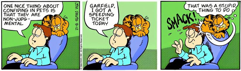 Jon está sentado en su silla con Garfield acurrucado detrás de su cabeza, y se dice a sí mismo lo agradecido que está de tener mascotas en quienes confiar, ya que nunca juzgan. Jon luego admite que recibió una multa por exceso de velocidad, y cuando Garfield escucha eso, golpea a Jon en la nuca.llamándolo estúpido. Claramente, Garfield no es el confidente sin prejuicios que Jon esperaba en una mascota, pero tal vez sea algo mejor.