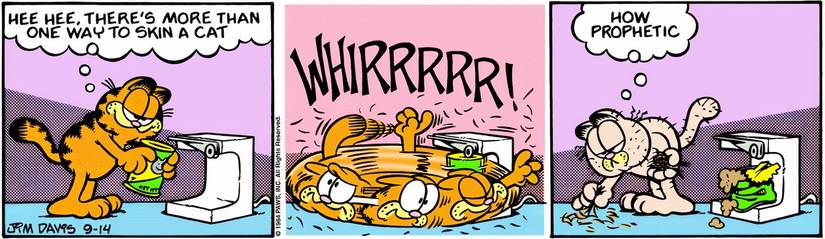 Garfield decide que va a abrir su propia lata de comida para gatos en lugar de esperar a que Jon lo haga, murmurando el viejo dicho: “Hay más de una forma de despellejar a un gato.” mientras lo hace. Pero entonces, el abrelatas eléctrico se vuelve loco y Garfield queda atrapado entre las cuchillas giratorias. Garfield literalmente es ‘desollado’ (más bien afeitado)antes de decirse a sí mismo: “Que profético“.