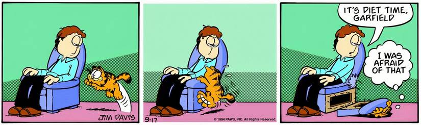 Mientras Jon está sentado en su silla, Garfield felizmente salta hacia él con la intención de acurrucarse en su regazo. Cuando Garfield salta a la silla, no pasa el reposabrazos. El gordo gato naranja se aferró a la silla, pero su peso resultó demasiado para el reposabrazos y se desprendió, lo que llevó a Jon a decirle a Garfield que necesitaba ponerse a dieta.