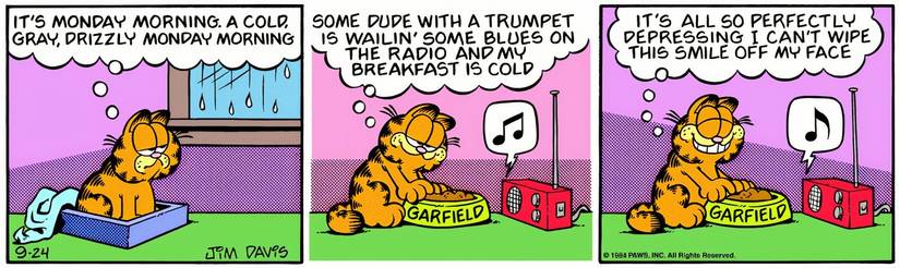 Cuando Garfield se despierta y nota que es lunes, los lectores podrían haber asumido que este cómic iba a ser otro ‘Garfield pierde el chiste’. Sin embargo, Garfield luego señala que está lloviendo, que tiene su comida favorita frente a él y que suena una canción que le encanta en la radio. En otras palabras, Garfield está teniendo un día muy agradable, a pesar de que es lunes.
