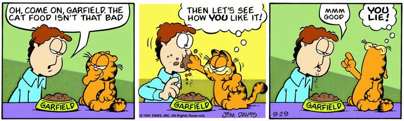 Es un hecho bien conocido que La comida favorita de Garfield es la lasaña.Sin embargo, a lo largo de su tira cómica, Garfield come constantemente comida para gatos normal. Es difícil imaginar que alguien a quien le guste un plato como lasaña (y mucho más “comida humana” que eso) pueda digerir comida normal para gatos a diario. Bueno, resulta que Garfield no puede, y trata de transmitirle su punto a Jon obligándolo a comer la comida para gatos y ver cuánto le gusta.