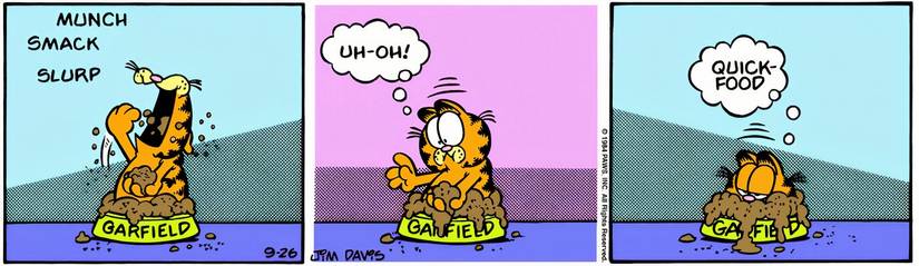 No es ningún secreto que a Garfield le encanta comer y, aunque la comida para gatos no es su favorita, toma un plato como si nada. Sin embargo, nunca en cien años Garfield pensó que la comida podría hacerle lo mismo. Pero esta historieta demuestra que estaba equivocado. Mientras Garfield va a la ciudad con un plato de comida para gatos, se encuentra sentado en la comida que está comiendo y lentamente comienza a hundirse en ella.