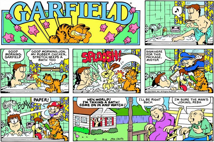 Cuando Jon intenta tener un momento para sí mismo bañándose, pero rápidamente descubre que eso no es posible.. Primero, Garfield entra al baño y dice que su pollo de goma, Stretch, también necesita un baño. Luego, Odie se une a ellos con un chapoteo gigante de bala de cañón. Después de eso, llega un paquete para Jon que debe firmar, y el repartidor le pide la firma a Jon a través de la ventana del baño.