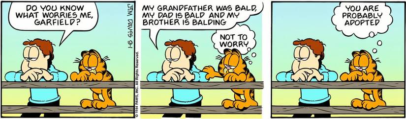 Cuando Garfield y Jon se quedan en la granja familiar de Jon y pasan el rato lejos de todos en la cerca de madera afuera de la casa, Jon confiesa algunas ansiedades que su familia le trajo a la mente. Jon dice que su abuelo era calvo, su padre es calvo y su hermano mayor se está quedando calvo. Por lo tanto, al propio Jon le preocupa que eventualmente se quede calvo. Sin embargo, Garfield decide aliviar sus ansiedades de una manera que sólo Garfield puede hacerlo, diciéndole: “Probablemente seas adoptado“.