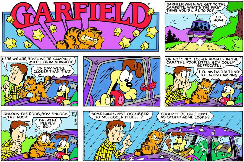 Cuando finalmente llegan al campamento, Jon y Garfield salen del auto para tomar el aire fresco y Odie cierra la puerta con llave “accidentalmente”. Odie queda atrapado dentro del auto, pero después de un tiempo (y una tormenta), Garfield y Jon lentamente comienzan a darse cuenta de que Odie pudo haber hecho lo que hizo a propósito. Odie estaba en el auto con todos los suministros y era el único que tenía comida y refugio.mientras Jon y Garfield estaban atrapados hambrientos y mojados afuera del auto.