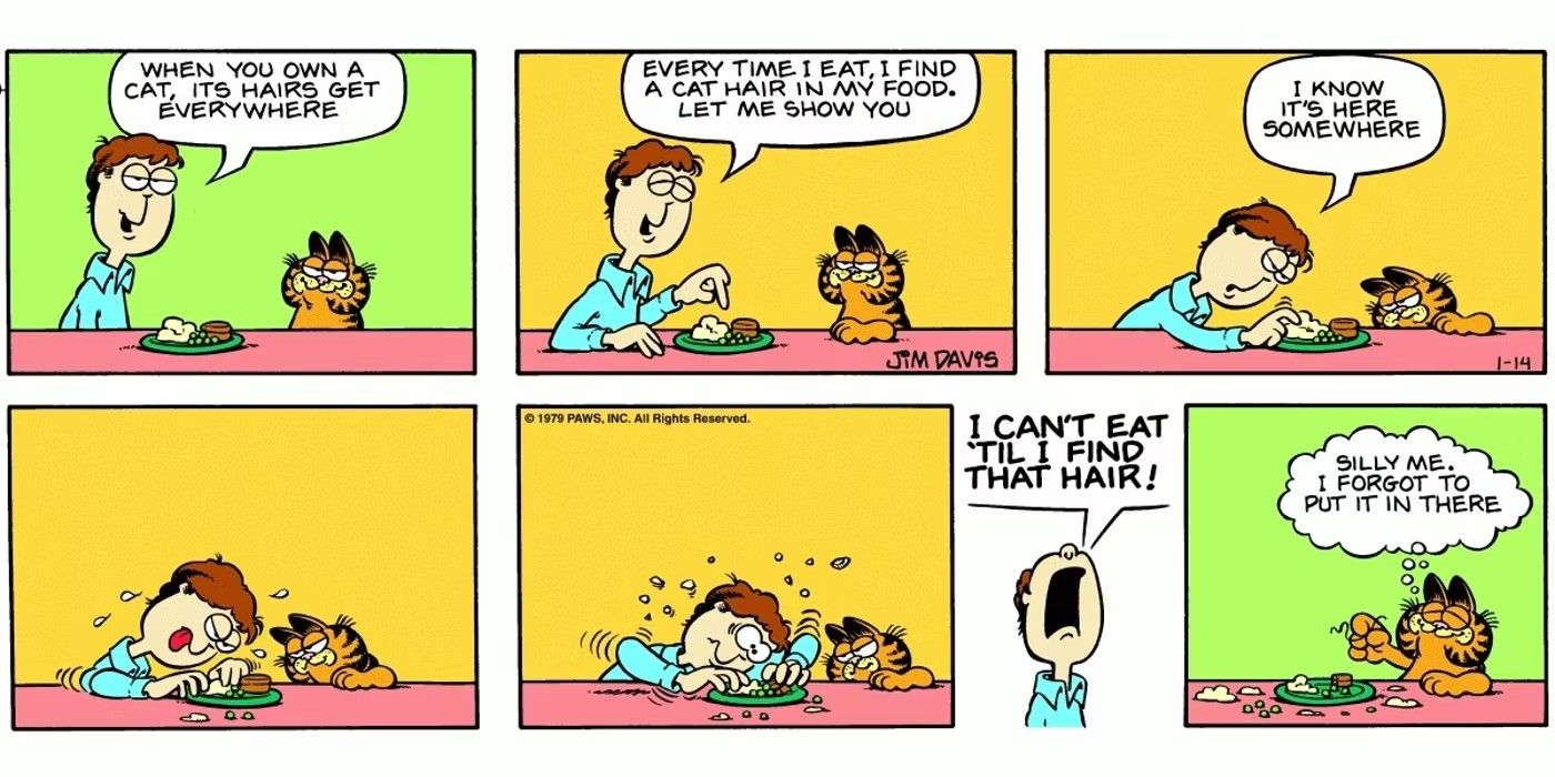 Una de las señales reveladoras de que un amigo tiene un gato es la cantidad de pelo de gato que llega a todas partes durante la temporada de muda. Por supuesto, Garfield encontró una manera inteligente de comentar esto en una histérica tira dominical que muestra a Jon tratando de estar un paso por delante. Él reconoce que siempre hay un pelo de gato en su comida, por lo que comienza a cavar para encontrarlo. Lamentablemente, Jon no puede ganar incluso cuando se demuestra la existencia de una molestia menor, y termina arruinando su propia comida por paranoia. El remate revela lo que todo dueño de gato debe haber sospechado en un momento u otro: la ubicación del pelo suelto de Garfield no es un accidente y, en realidad, está torturando a su dueño por diversión.
