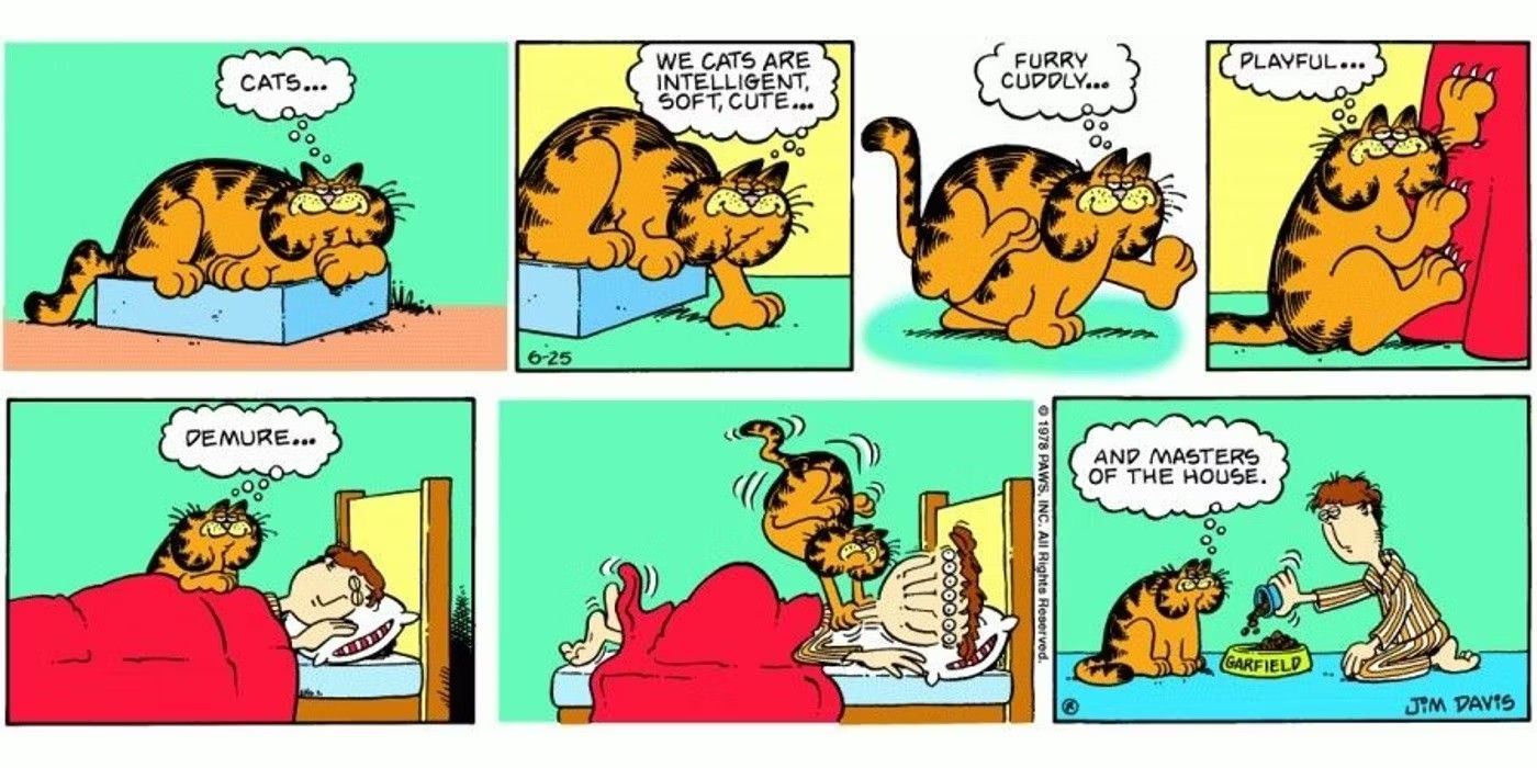 El punto inicial no es otro que la primera tira de garfield. A pesar de que en su mayoría solo se presenta, las interjecciones de Garfield son muy identificables para los dueños de gatos. No sólo considera que Jon es “suyo” y no al revés, sino que inmediatamente exige que lo alimenten en medio de la introducción de Jon, dejando en claro que tiene prioridades más apremiantes que entretener al lector. Los dueños de gatos saben que los gatos marchan al ritmo de su propio tambor y que la gratificación diferida nunca será su fuerte, incluso cuando sus humanos preferirían que se concentraran en dar una buena primera impresión.