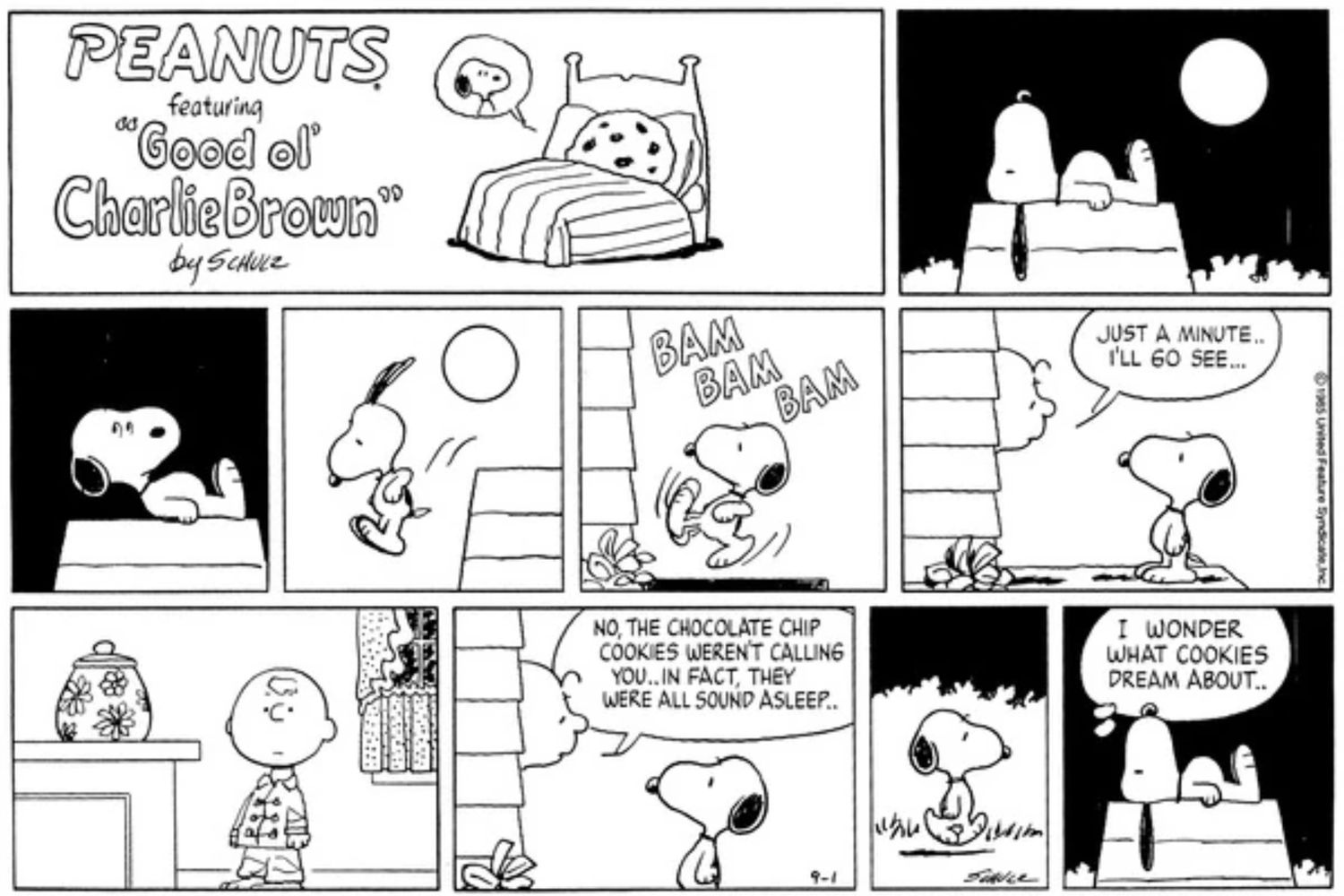 A Snoopy le encantan las galletas con chispas de chocolate. Los ama tanto que puede rastrearlos desde muy lejos y, como señala esta tira de 1985, incluso cree que las galletas con chispas de chocolate lo llaman. Su obsesión por el dulce es lo suficientemente fuerte como para despertarlo en medio de la noche y despertar al pobre Charlie Brown solo para ver si las galletas realmente lo están llamando. Es sorprendente que este recado nocturno no haya inspirado a Charlie a decir su marca registrada. “¡Caramba!” En un ejemplo del uso inteligente del arte adicional por parte de Schulz, la tira comienza con una imagen de una galleta soñando con Snoopy, y regresa como respuesta a la última pregunta del amado perro.