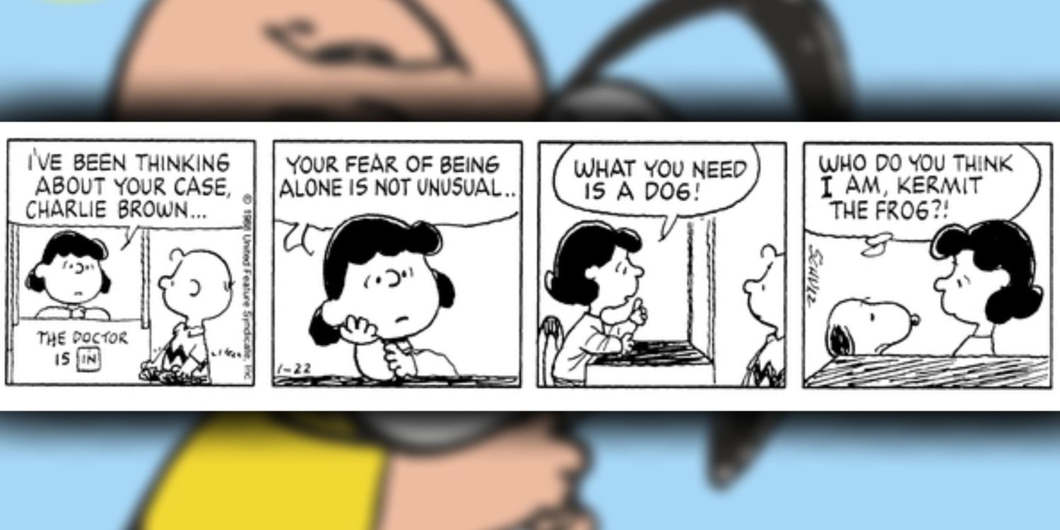 Charlie Brown frecuentemente está deprimido, lo que requiere la supuesta experiencia de la psicóloga en ciernes Lucy. Su consejo no suele ser muy útil y, en esta tira de 1988, ofende francamente al perro de su cliente. La respuesta de Snoopy es perfectamente atrevida, ya que Lucy aparentemente ha olvidado que, además de ser parte de la pandilla, Snoopy también es una querida mascota. Esta tira muestra cuán malos pueden ser los consejos de Lucy: no sólo olvidó que Charlie Brown ya tiene un perro, pero la solución claramente no funciona de todos modos.