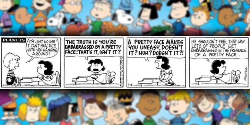 Por mucho que lo intente, Lucy siempre termina con una L cuando se trata de su amor no correspondido por Schroeder. Sin embargo, eso no le impide volver por más y seguir interrumpiendo sus sesiones de piano. Por lo general, Schroeder tolera sus interrupciones mientras intenta jugar, pudiendo ignorarla. Sin embargo, en este cómic, ha llegado a su punto límite y exclama que ya no puede practicar su forma de tocar mientras ella esté allí. Lucy encuentra una razón interesante para su negativa a jugar frente a ella: le da vergüenza jugar frente a alguien con una cara tan bonita como la de ella. Al negarse a tomárselo como algo personal, decide proteger su ego, una clásica maniobra de Lucy que la ha mantenido molestando a Schroeder durante décadas. Miseria historietas.