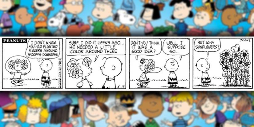 En esta tira, la hermana pequeña de Charlie, Sally Brown, hace el gesto cariñoso de plantar flores alrededor de la caseta del perro de Snoopy. Lamentablemente para el beagle, las flores resultan ser girasoles, lo que esencialmente lo oculta de la vista. Es una imagen divertida y la reacción de desconcierto de Snoopy es perfecta. La protección también puede ayudarle a mantener seguros sus diversos tesoros, creando un sistema de seguridad perfecto cuando se complementa con pasar tiempo con Linus.