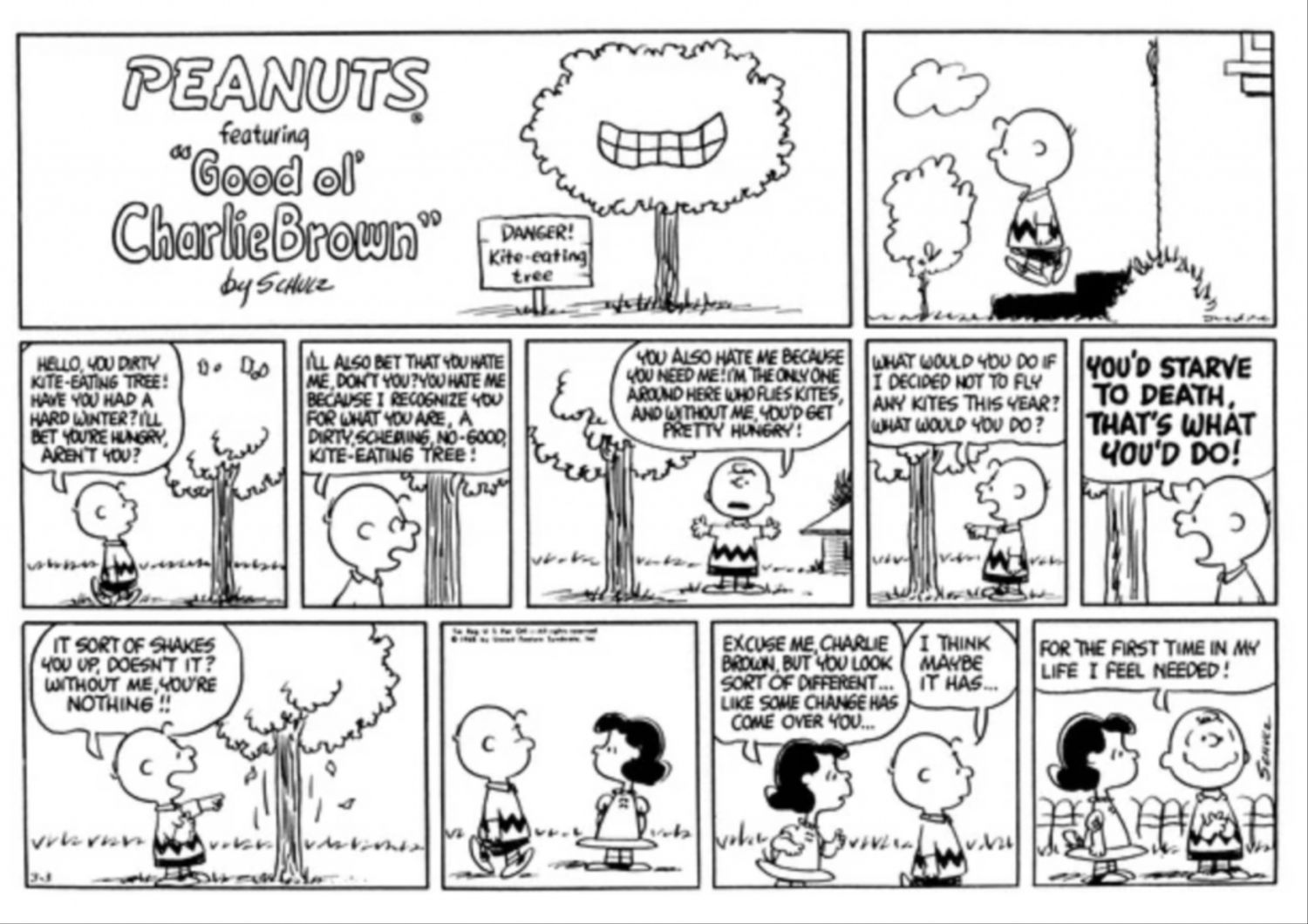 Con un cartel que advierte contra la amenaza del árbol comecometas, parece que ya es demasiado tarde para Charlie Brown. Él ya está enganchado por alimentar a las cometas de los árboles porque nadie más vuela cometas alrededor de la planta masticadora (probablemente aprendieron la lección después de que sucedió una vez, a diferencia de Chuck). Sin él y sus cometas, el árbol moriría. Charlie le deja esto muy claro al árbol, gritándole en detalle, todo a plena luz del día. Si bien puede parecer que Charlie Brown está bastante enojado, en realidad está eufórico porque se siente necesario por una vez a pesar de haberle gritado al árbol momentos antes. ¿Relación tóxica mucho?