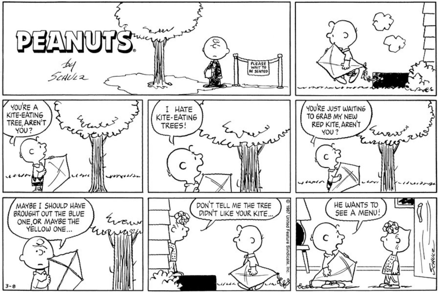 Publicado en 1965Charlie Brown y el árbol come cometas en Peanuts.