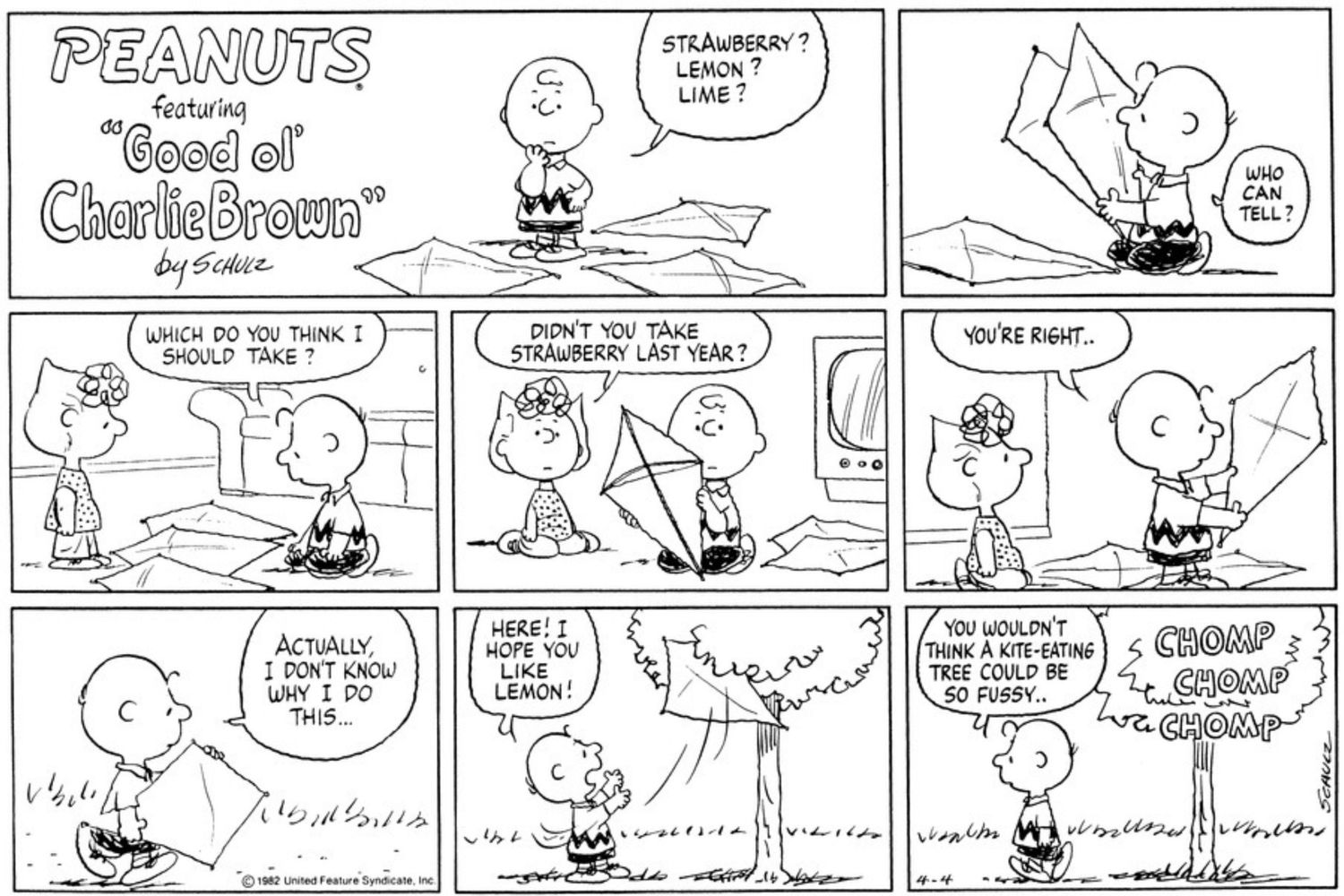 Uno no pensaría que las cometas tienen sabores. Sin embargo, según un árbol que come cometas, hay cometas de diferentes sabores, y el árbol en cuestión es particularmente exigente con sus gustos preferidos. En lugar de evitar el árbol por completo, Charlie Brown reflexiona sobre qué sabor le gustaría que le aportara el árbol. Al decidirse por el limón, Charlie se pregunta cómo es posible que un árbol sea tan exigente. Como si el árbol no fuera ya muy molesto para Charlie Brown, las delicadas papilas gustativas del árbol lo empeoran aún más, si los árboles tuvieran papilas gustativas.