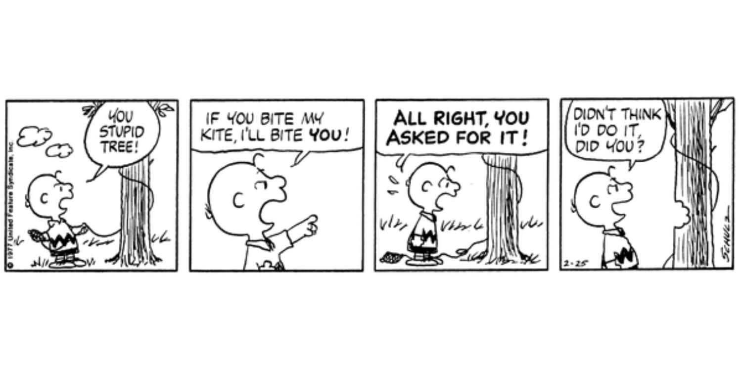 Charlie Brown suele ser bastante sensato, incluso cuando los niños del vecindario lo molestan implacablemente. Sin embargo, el árbol come cometas saca a relucir lo peor de Charlie Brown, lo que hace que se comporte de maneras completamente inesperadas para el malhumorado estudiante de primaria. En esta tira, está tan indignado con el árbol que incluso le da un mordisco. El árbol probablemente no lo vio venir. De todos modos, el acto le resulta contraproducente a Charlie porque poco tiempo después recibe una carta de la Agencia de Protección Ambiental.