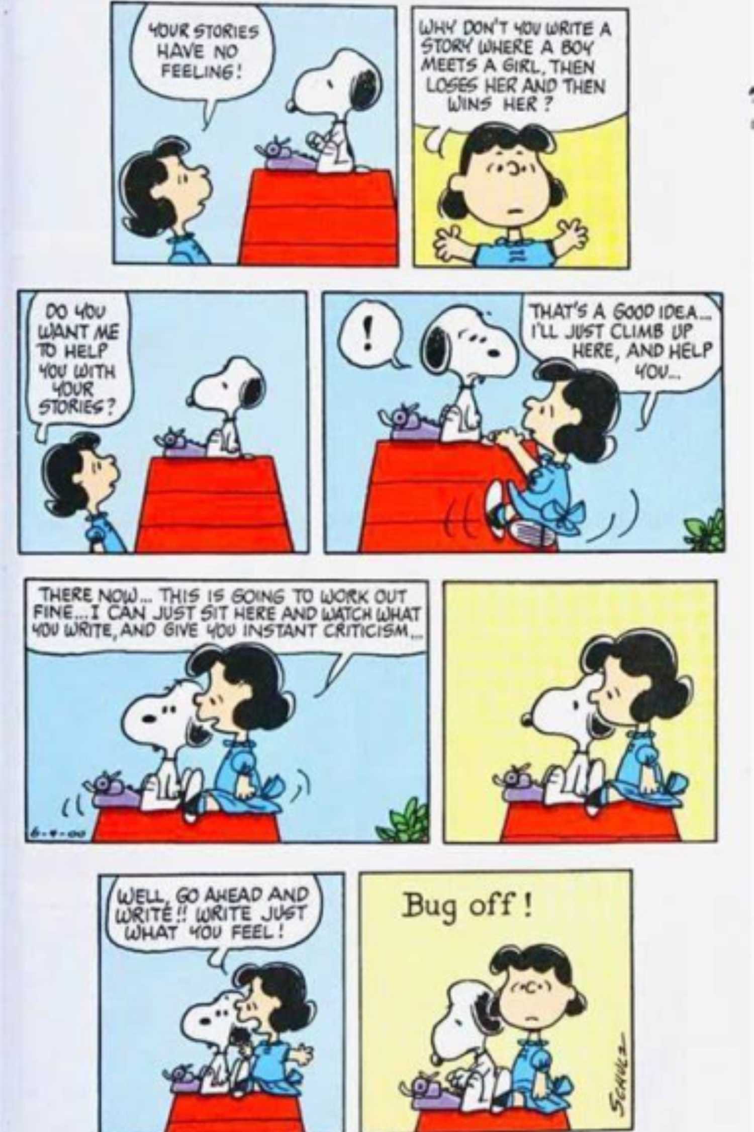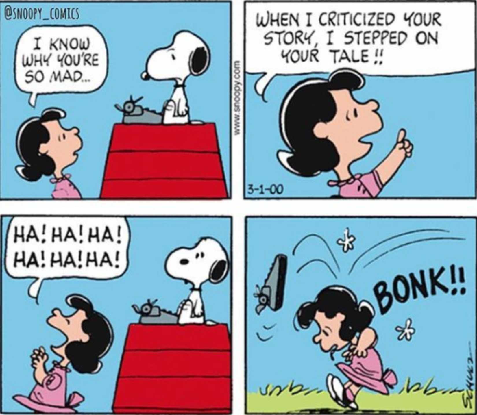 A pesar de que los intentos anteriores de ayudar a Snoopy con sus escritos resultaron ser polémicos, Lucy no aprendió la lección, como se evidencia más adelante. Miseria trabajar. Asimismo, Snoopy también ha tenido poca paciencia con los chistes cursis, un ejemplo es cuando le arrojó su plato de perrito a Charlie Brown cuando hizo una broma. Cuando Lucy ofrece su propio chiste con mucho juego de palabras después de criticar la escritura de Snoopy, que a Snoopy no le parece gracioso, le arroja toda su máquina de escribir.