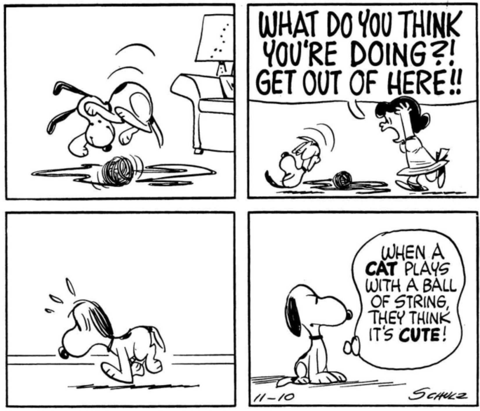 Los perros y los gatos suelen estar enfrentados, pero eso no significa que las dos especies no tengan nada en común. A Snoopy, a pesar de pertenecer al género de los Canis (también conocidos como perros), le gusta jugar con lana como lo haría un gato. La mayoría piensa que los gatos que juegan con hilo son adorables, por lo que tiene sentido que la gente encuentre igualmente entrañable un perro tan lindo como Snoopy jugando con hilo. Lucy, sin embargo, no es como la mayoría de las personas y se enfurece cuando ve a Snoopy con el ovillo de hilo y lo ahuyenta de su casa.