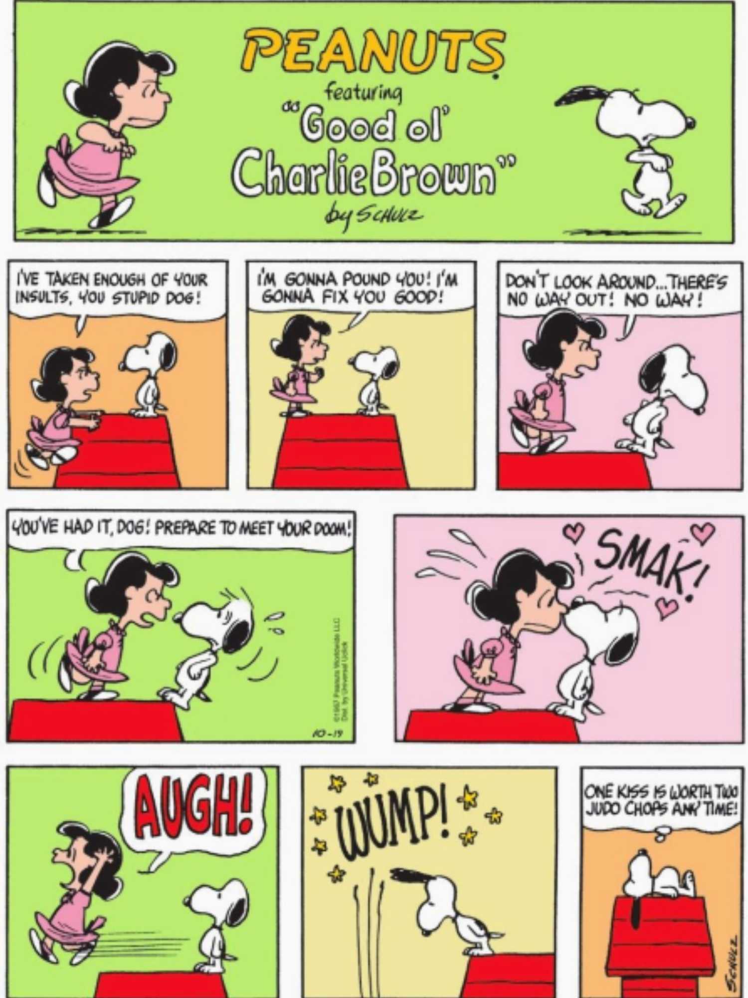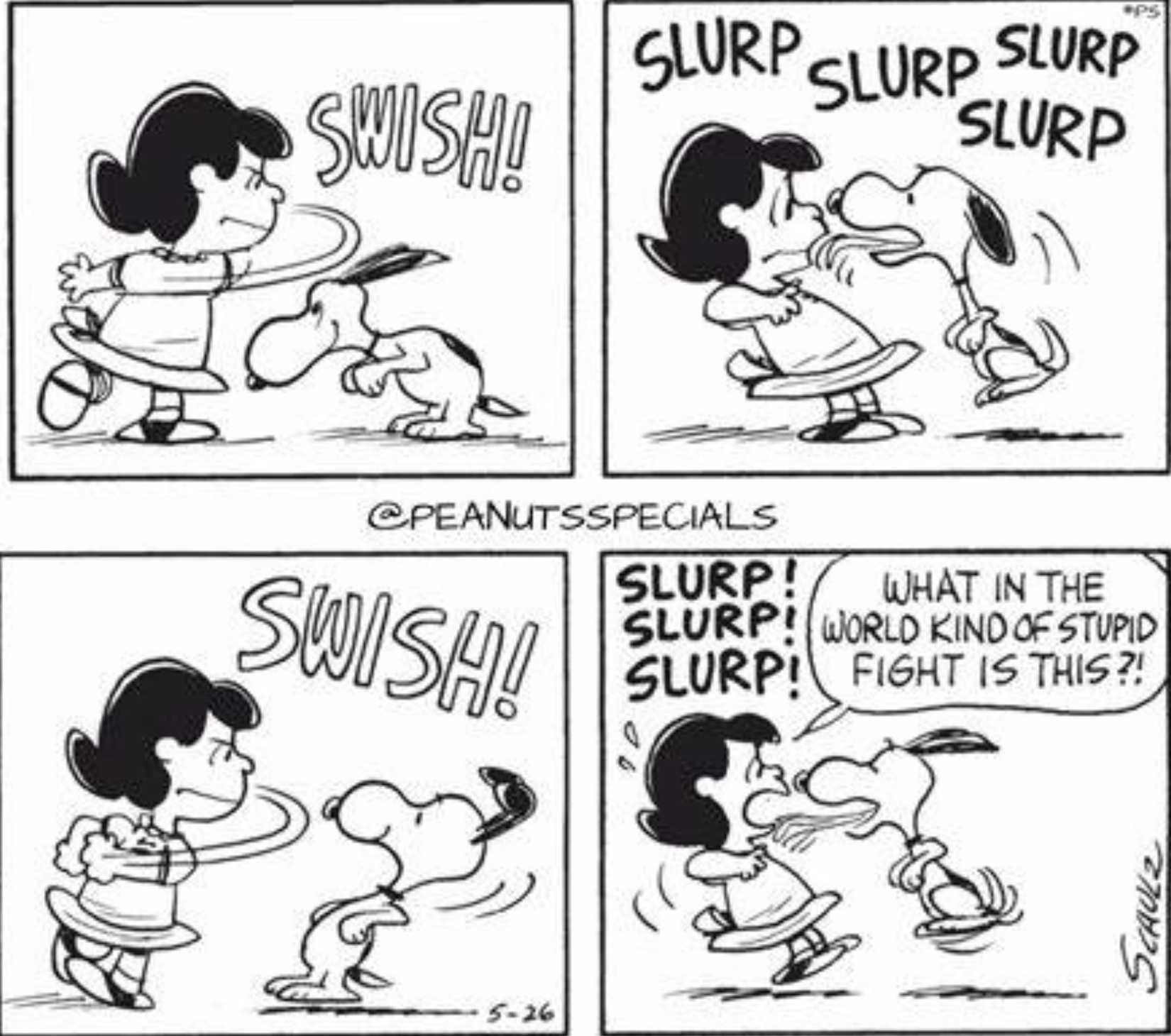 Las discusiones de Snoopy y Lucy tienden a convertirse en peleas a puñetazos. Técnicamente, son peleas a puñetazos y besos de perros, pero de todos modos sus peleas se vuelven físicas. Un cómic ambienta la escena en mitad de la pelea, donde ya están llegando a las manos. Por lo tanto, los lectores pueden observar de cerca sus diferentes estilos de lucha; Lucy, el método de puñetazo más tradicional, Snoopy, el método más exclusivo de lamerle la cara.