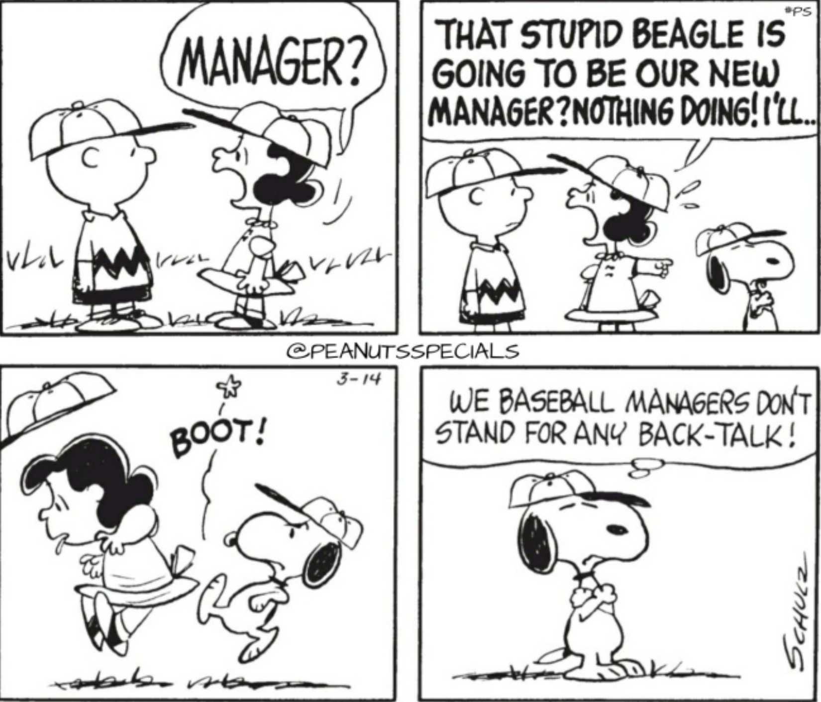 En su nuevo rol como manager, Snoopy decidió gobernar con mano de hierro, pateando el trasero de cualquier jugador que se atreva a ir en su contra, jugar mal o insultarlo, como suele hacer Lucy, como en este cómic. Obviamente, Snoopy se está tomando en serio su puesto como director de béisbol, un poco demasiado en serio, y no se gana ninguna admiración por parte de Lucy como nueva líder del equipo.