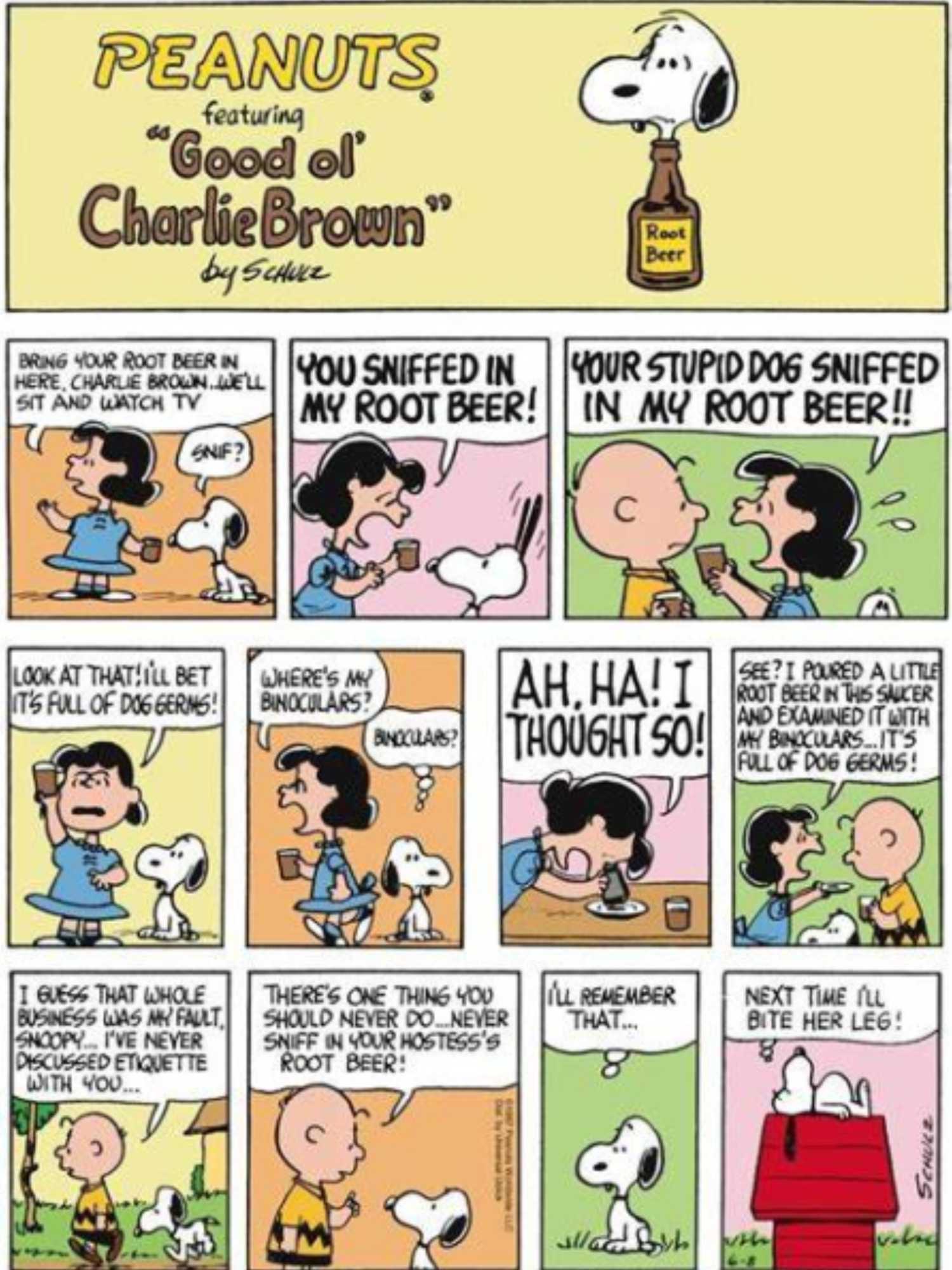En lugar de tomar el consejo en serio después de que lo echaron de la casa de Lucy, Snoopy decide que la próxima vez le morderá la pierna en lugar de oler su bebida, lo que no parece una gran mejora. Uno de los muchos aspectos divertidos del cómic es hasta dónde Lucy está dispuesta a llegar para dejar claro su punto sobre los gérmenes de perro en su bebida, incluso tomando sus binoculares y mirando la cerveza de raíz como si estuviera bajo un microscopio.