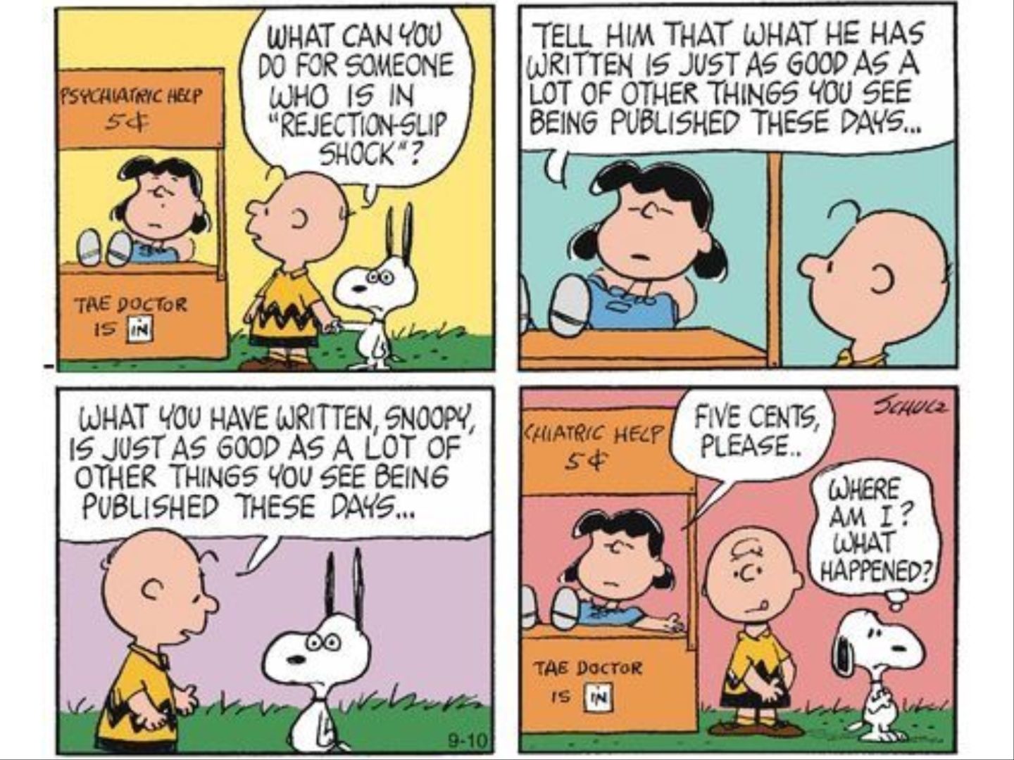 Como su personaje de autor mundialmente famoso, Snoopy ha recibido demasiadas cartas de rechazo como para contarlas sobre su trabajo. En esta tira, otro error de rechazo es demasiado para Snoopy y lo pierde. Está en estado de shock, incapaz de hacer nada ni de hablar. No es hasta que recibe ayuda psiquiátrica de Lucy que vuelve a la normalidad.