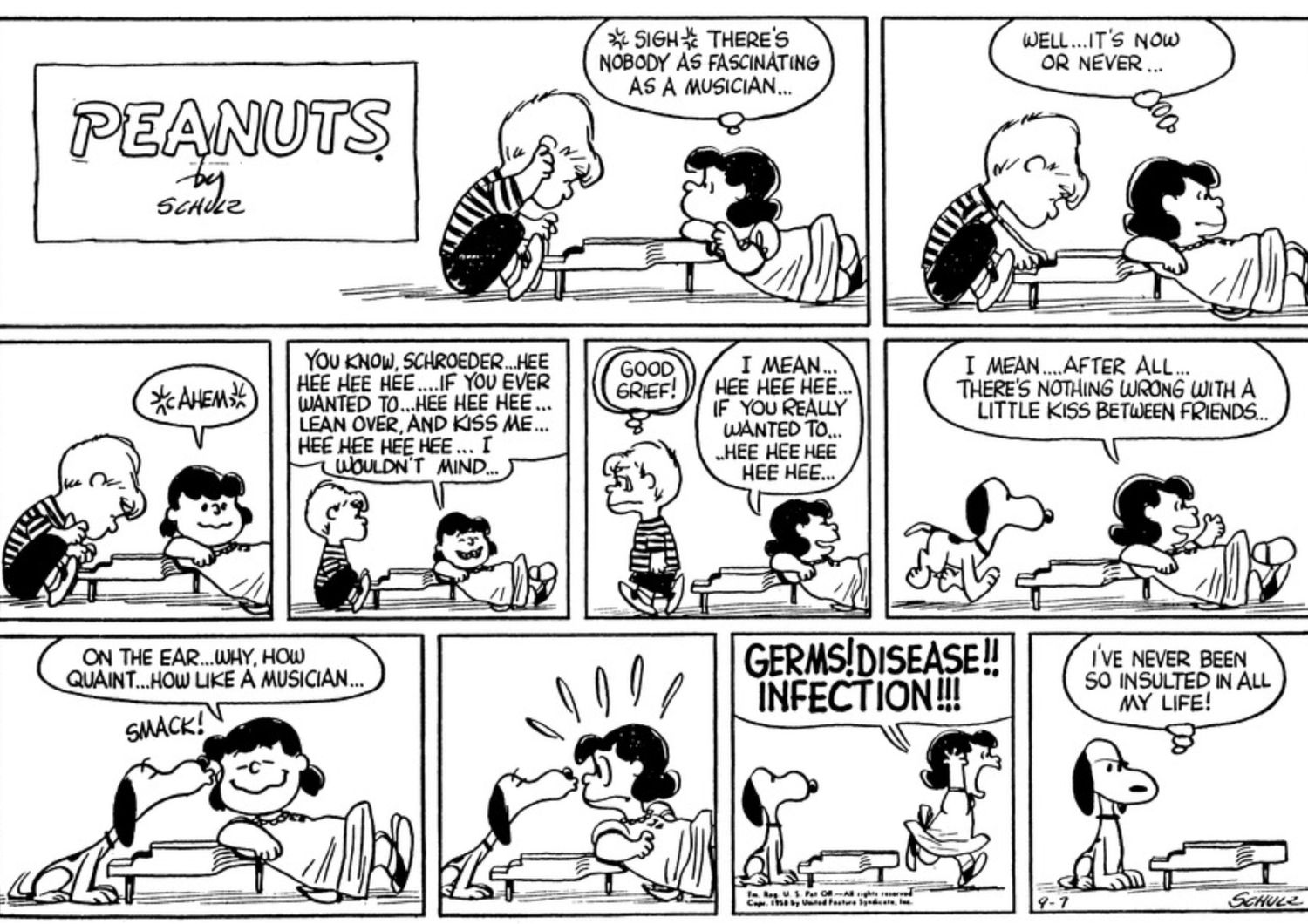 “/> Lucy no es la más sutil ni la más diplomática. Rara vez piensa antes de hablar, lo que a menudo puede resultar en que alguien se sienta insultado o herido. En esta tira, intenta conseguir un beso de Schroeder, pero obtiene más de lo que esperaba cuando Snoopy la besa.