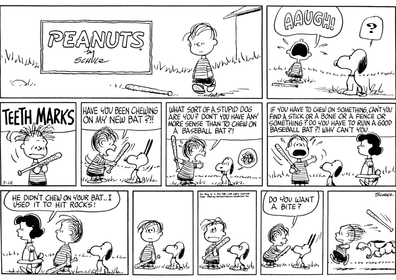“/> Tan malo como el Miseria Como es el equipo de béisbol de su pandilla, Linus todavía se preocupa profundamente por su bate. Es por eso que cuando ve su bate todo desordenado por lo que parecen marcas de dientes, pierde los estribos con el pobre Snoopy. Para empeorar las cosas, Lucy aclara que las marcas en el murciélago no son marcas de dientes, sino de ella misma golpeando rocas.
