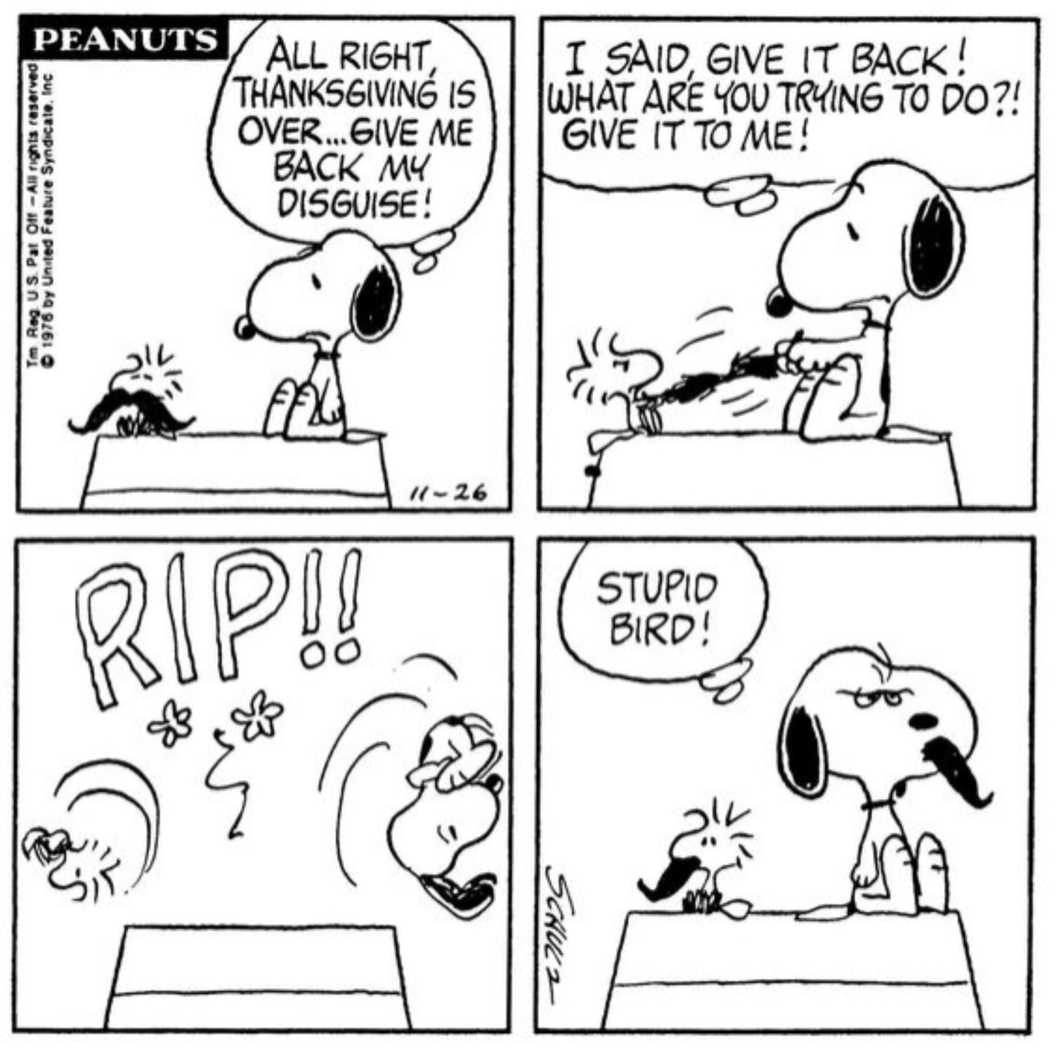 Después de que Snoopy le presta a Woodstock su bigote disfrazado para evitar que se lo coman el Día de Acción de Gracias, el atrevido beagle le exige que se lo devuelva. Woodstock no está muy interesado en devolver el bigote, lo que hace que los dos discutan hasta que lo parten en dos. Snoopy, que suele ser muy tranquilo y comprensivo con su amigo, está extremadamente enojado con Woodstock. Ahora, cada uno solo tiene medio bigote, lo que no constituye un gran disfraz.