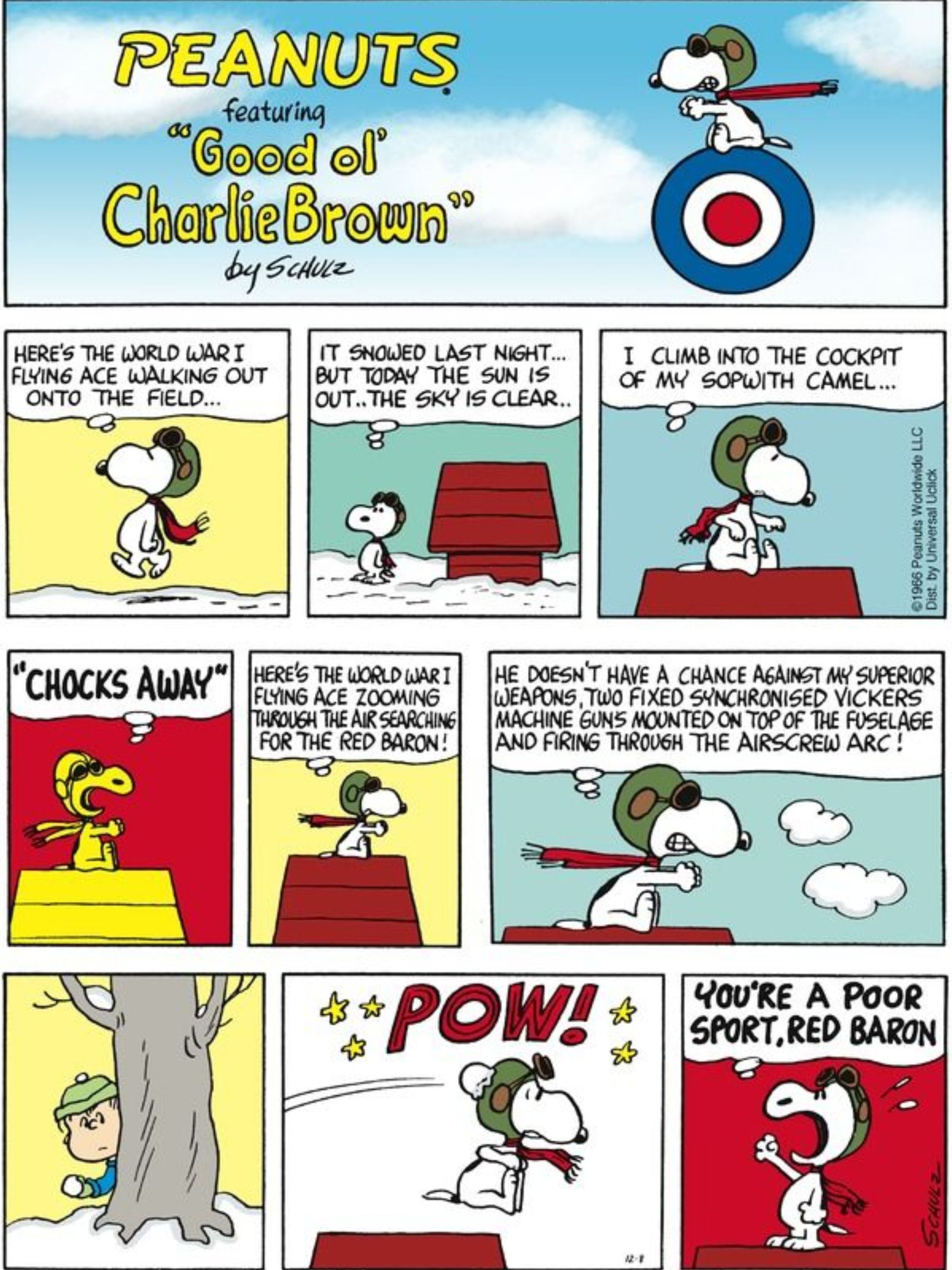 Cuando se ve envuelto en una batalla (imaginaria) con el Barón Rojo, está en alerta máxima, como se muestra en esta tira. En consecuencia, cuando uno de los Miseria Niños, Snoopy atribuye el ataque furtivo a su némesis.
