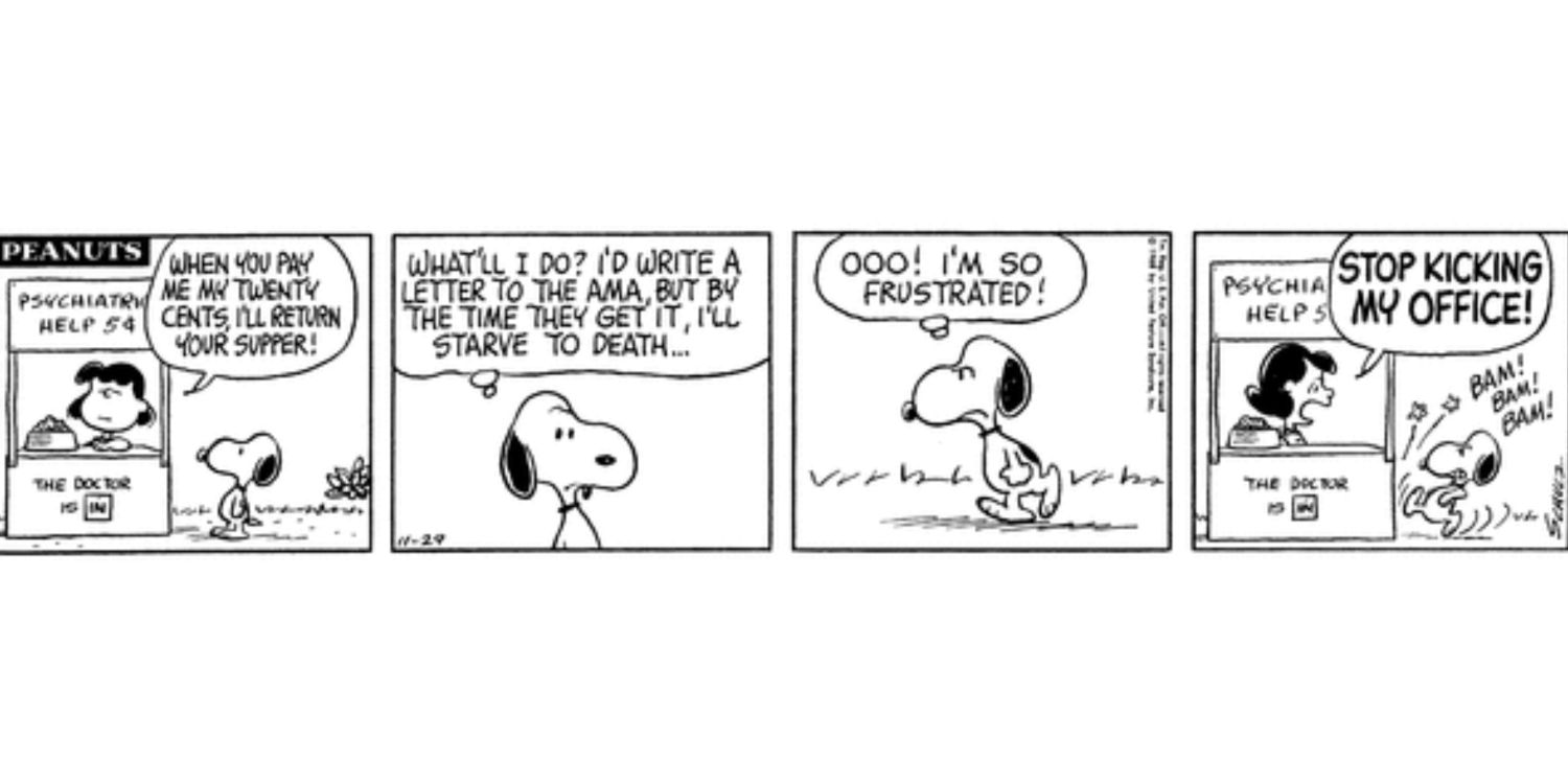 “/> Lucy atiende a muchos clientes en su cabina de psiquiatría, pero eso no significa que todos los clientes salgan satisfechos. Algunos, como Snoopy, se van completamente furiosos. Cuando Lucy retiene la cena de Snoopy porque no le ha pagado por sus servicios psiquiátricos, él se molesta muchísimo.