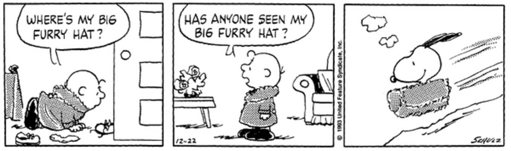Una mordaza corriente en Miseria’ Las tiras cómicas de invierno son el guardarropa de invierno de Charlie Brown, que generalmente incluye su gran abrigo de piel, su gran sombrero de piel y, a veces, una bufanda de lana. Su voluminosa ropa de invierno le impide hacer incluso las cosas más mundanas o lo mantiene oculto para que nadie lo reconozca. En esta tira cómica, que continúa el chiste, a Charlie Brown le falta una parte importante de su conjunto de invierno.