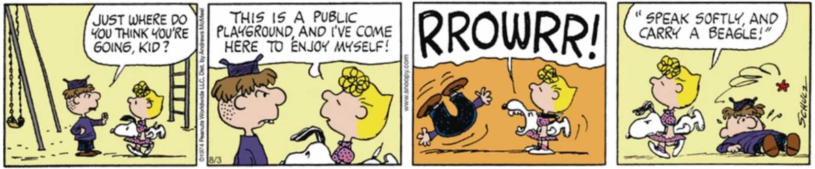 Después de que un niño grosero del vecindario intenta impedir que Sally entre al patio de recreo, Sally se niega a dar marcha atrás y decide defenderse. Siguiendo el ejemplo de las famosas palabras de Theodore Roosevelt, “habla en voz baja y lleva un gran garrote”. Sally le da su propio giro, lo que requiere a Snoopy: “Habla en voz baja y lleva un beagle.“ Decidiendo ser un perro guardián leal para Sally, Snoopy le ruge al matón del patio de recreo para que Sally finalmente pueda entrar al patio de recreo.