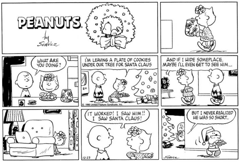 Durante MiseriaEn los cómics de diciembre de 1990, a Snoopy se lo encontraba con frecuencia vistiendo un disfraz de Papá Noel, ya sea de pie y tocando una campana para pedir donaciones o simplemente en casa escuchando la lista de Navidad de Sally. Llevando su personaje de Santa un paso más allá, toma las galletas que Sally le deja a Santa, haciéndole creer que vio la verdadera cosa. lo que la llena de alegría y emoción por haber visto a Santa Claus en persona. Snoopy, siendo la mascota obediente que es para Sally y solo para Sally, desempeña el papel y no le revela la verdad a la joven Sally.