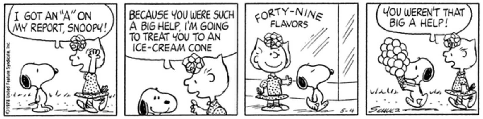 Todo el abuso verbal no fue en vano, sin embargo, Sally obtuvo una A en su informe, lo que la llevó a comprarle a Snoopy un cono de helado como agradecimiento por su ayuda.Snoopy, manteniéndose fiel a sus tendencias gastronómicas, se excede un poco en la heladería y aparentemente obtiene una cucharada de cada uno de los 49 sabores.