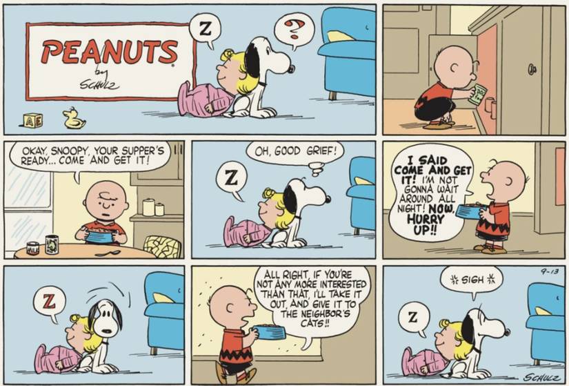 A Snoopy pocas cosas en la vida le importan más que su cena. Por lo general, dejará cualquier cosa en espera para cenar e incluso ha dejado de lado su orgullo para la cena antes. En un gesto absolutamente dulce de Snoopy, cuando Charlie Brown lo llama para cenar, Snoopy, que tiene a Sally durmiendo contra él, no se mueve ni un centímetro a pesar de querer desesperadamente correr a cenar.