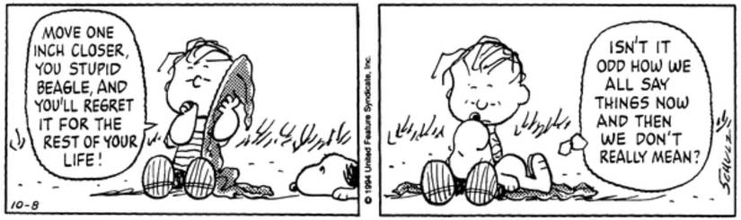 Linus está sentado en el césped con su manta cuando Snoopy llega olfateando y arrastrándose sigilosamente sobre su vientre hacia la manta de Linus. Linus le dice al astuto cachorro que retroceda y que si se acerca más, se arrepentirá. Sin embargo, en el siguiente panel, se ve a Snoopy recostado en el regazo de Linus, comentando cómo la gente siempre dice cosas que no quieren decir. Y, curiosamente, a Linus no parece importarle.