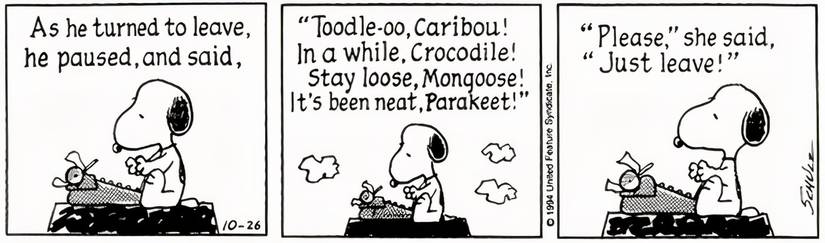 Durante años, Snoopy ha estado trabajando en su ‘Gran novela americana’ y, de todos los extractos que los fanáticos han podido leer durante ese tiempo, esta es sin duda la cosa más divertida que jamás haya escrito. Snoopy está escribiendo una escena en la que un hombre deja a una mujer, y este es su diálogo mientras se marcha: “Toodle-¡oh, caribú!“, “¡Dentro de un rato, cocodrilo!“, “¡Mantente suelta, mangosta!“, “¡Ha estado genial, periquito!“. ¿Y la respuesta de la mujer?”Por favor. solo vete“.