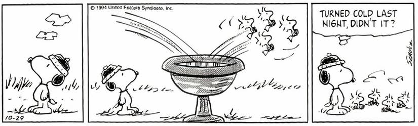 Snoopy está parado junto a una fuente para pájaros en su jardín cuando cuatro pájaros vuelan y aterrizan en la fuente para pájaros. Sin embargo, el agua del bebedero para pájaros está congelada y los pájaros se deslizan. Snoopy luego los mira y dice: “Anoche hizo frío, ¿no?“, tanto para entablar una conversación ligera sobre el clima como para señalar que los pájaros no prestaron suficiente atención al lugar hacia el que volaban.